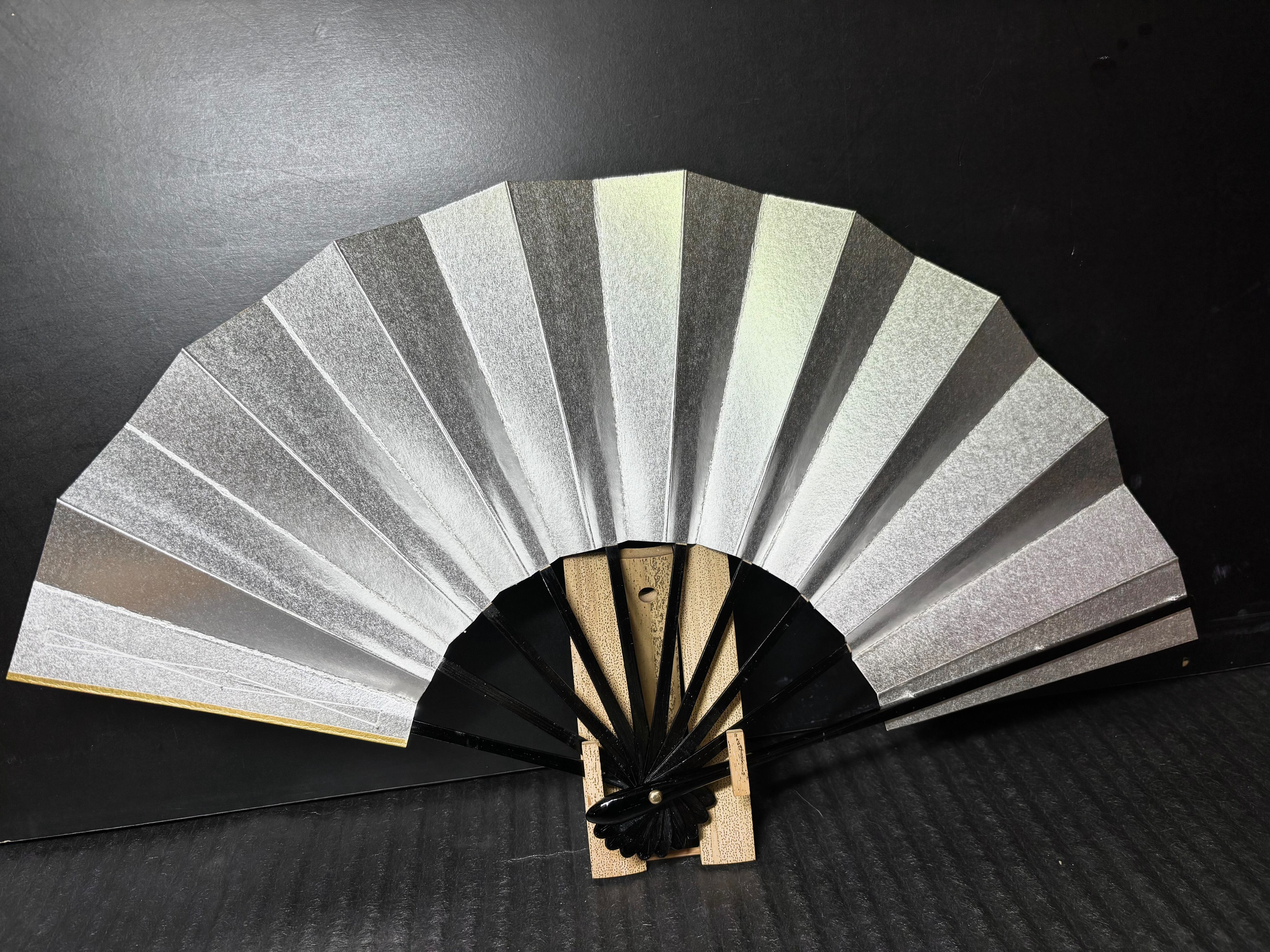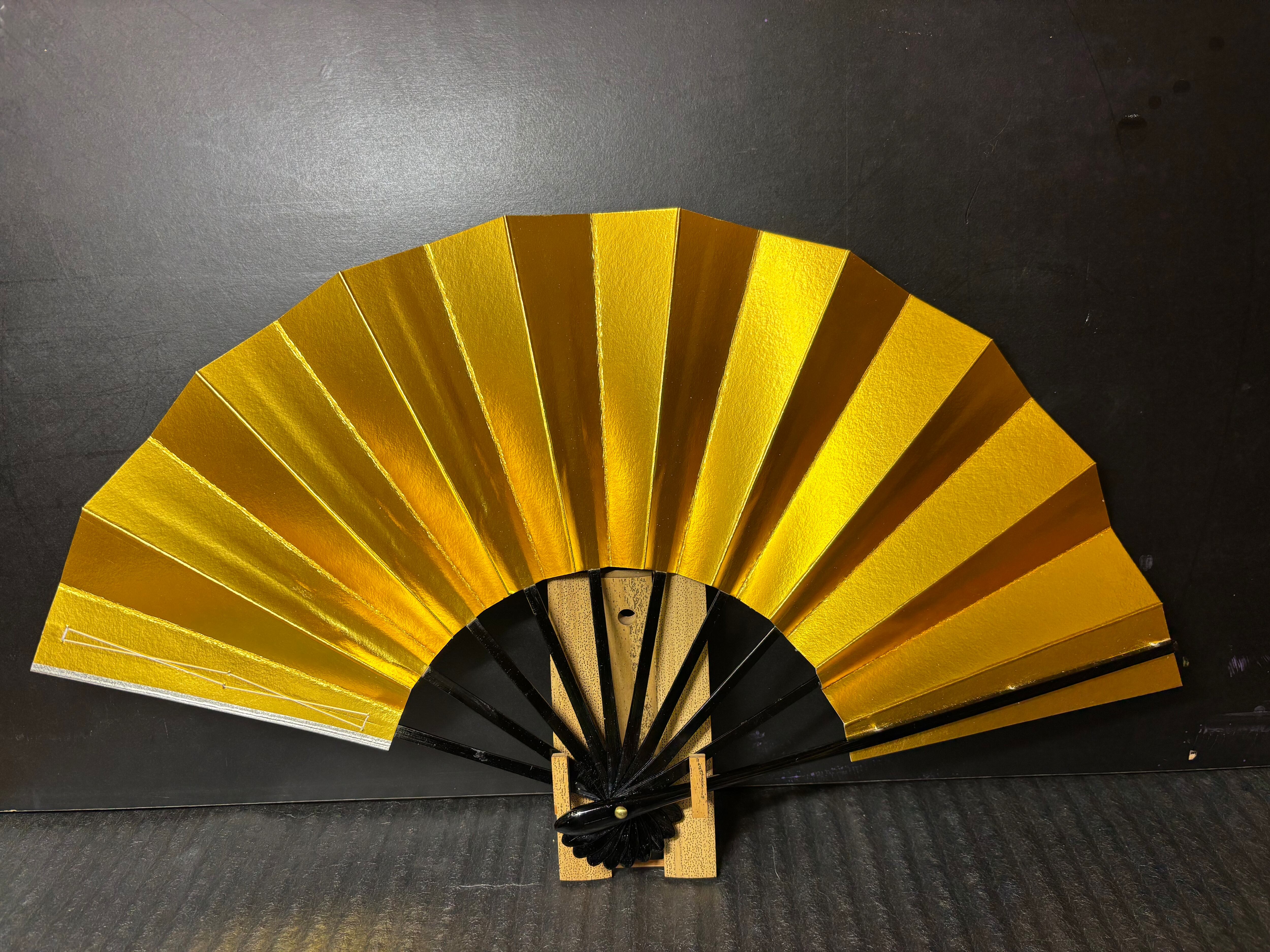 美しい金の表面と、シックな銀の裏面を持つ舞扇子です。特別なシーンを華やかに演出するアイテムとしておすすめです。