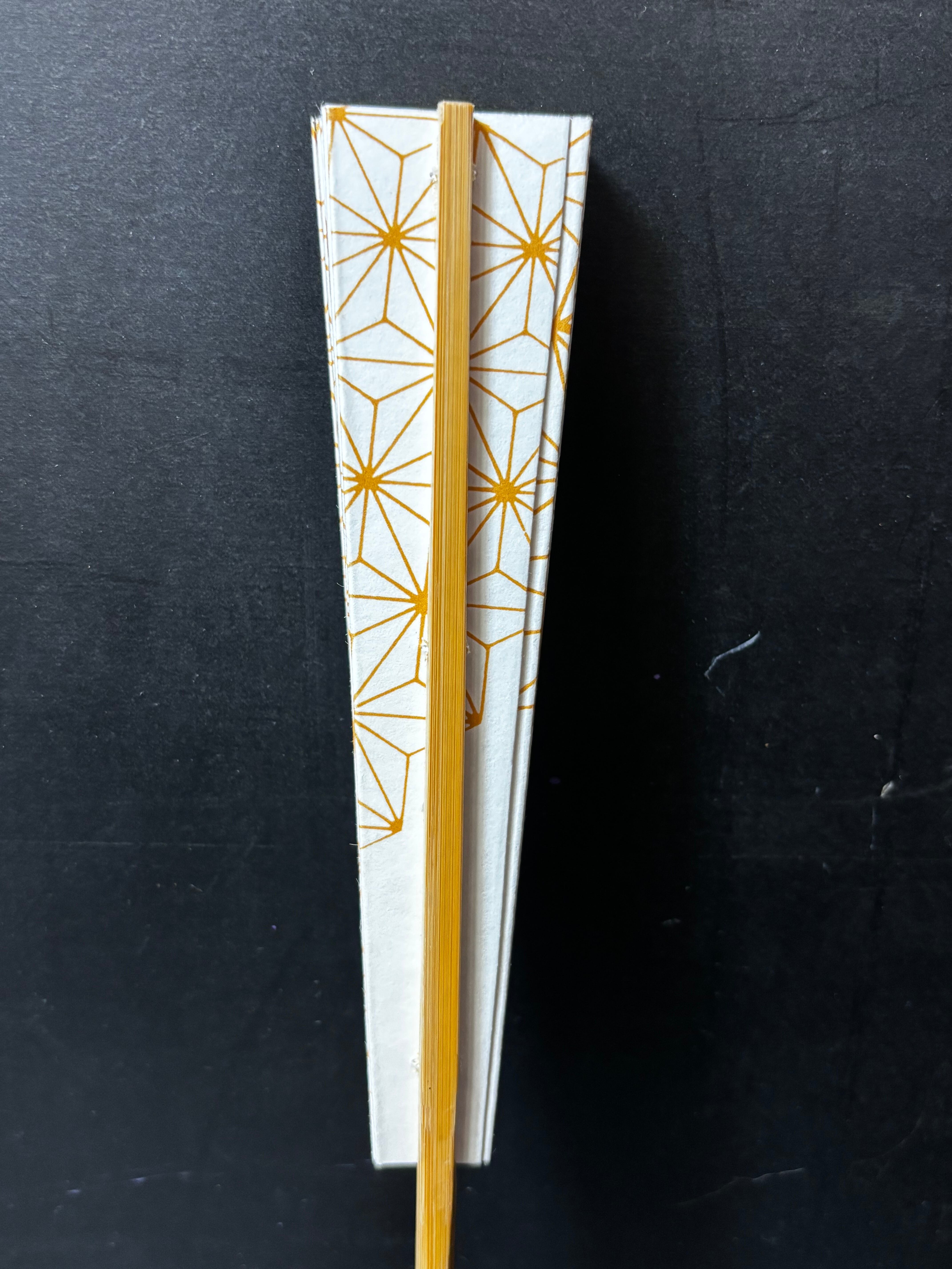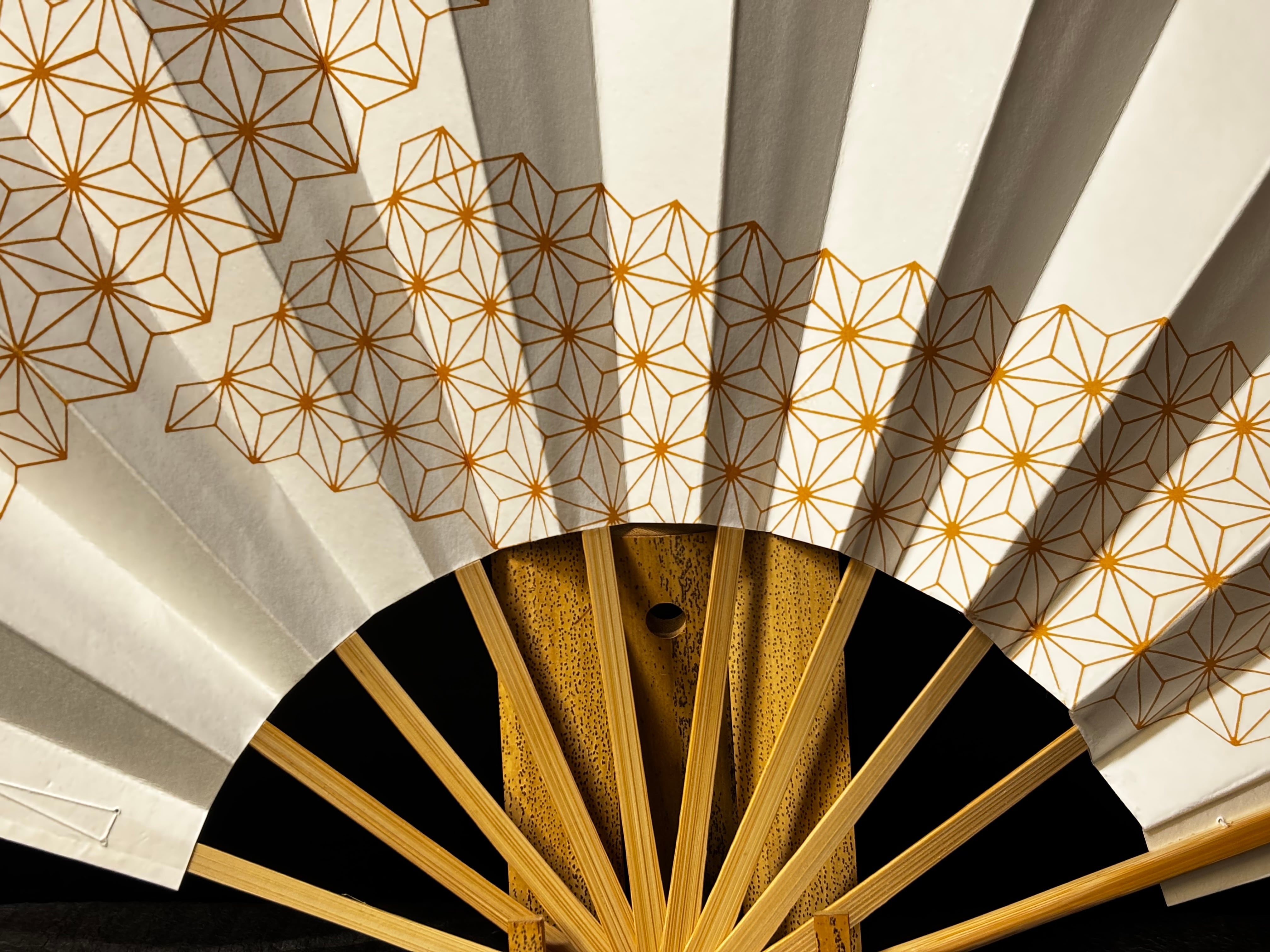 寸法は一般的な舞扇子の大きさである9寸5分(約29㎝)。山吹色の麻の葉柄が両面に鮮やかに施されたデザインで、白地との組み合わせが魅力的です!