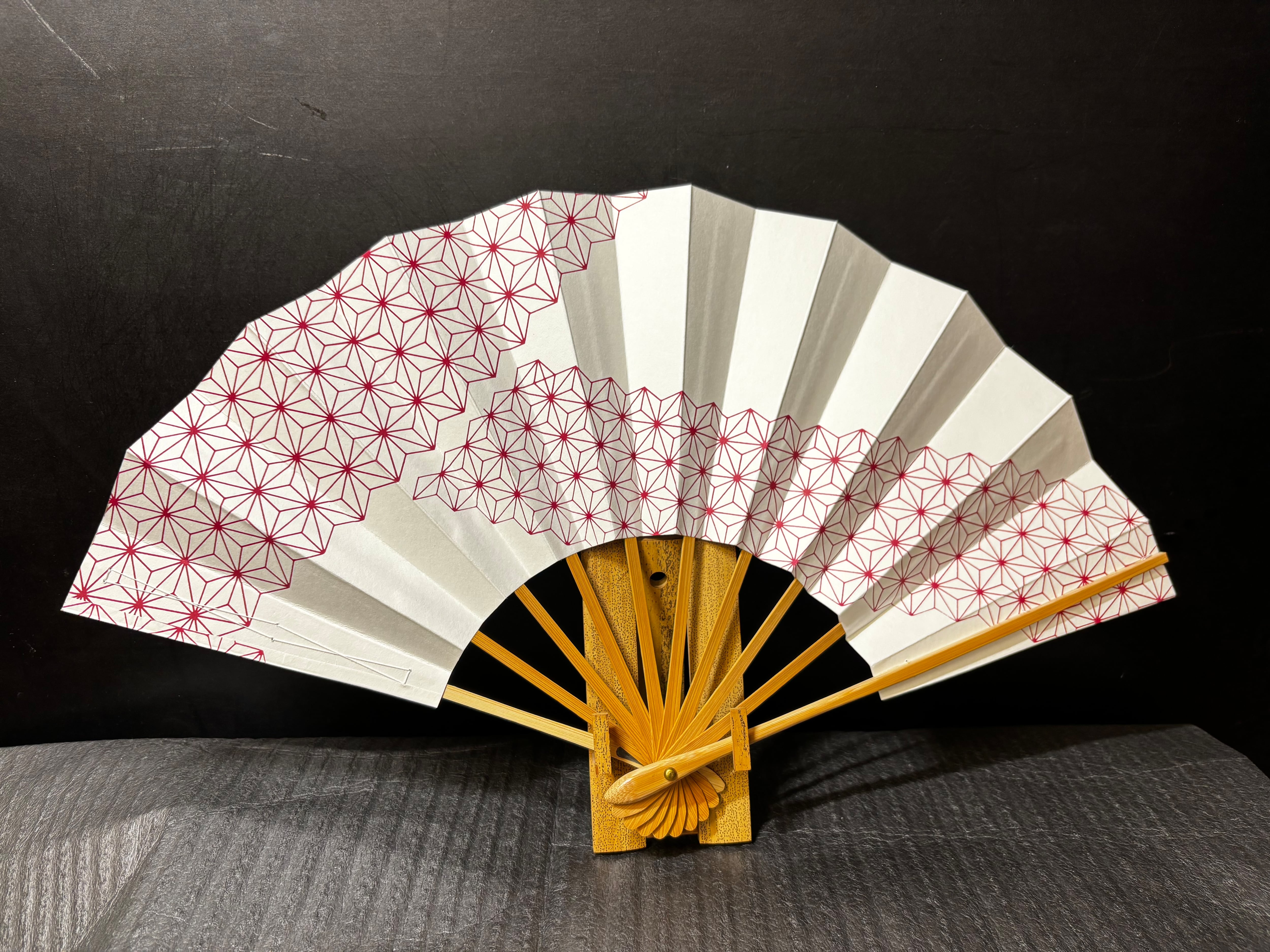 寸法は一般的な舞扇子の大きさである9寸5分(約29㎝)。可愛らしい赤色の麻の葉柄が両面に施されており、白地とのコントラストが鮮やかです!流行のデザインでありながら、伝統的な要素を大切にしたこの舞扇子は、お稽古や特別なシーンにぴったりのアイテムです。ぜひ、お手元でその魅力を体感してみてください!