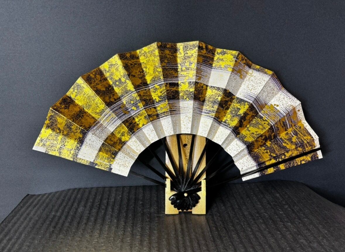 砂子地に紺色の刷毛目を引き、さらにのぎと小石をプリントした、手の込んだ舞扇子です。黒のぬり骨が引き締まったイメージで、舞台での華やかな演出にも活躍します。