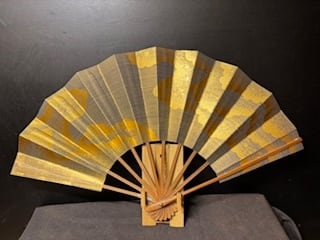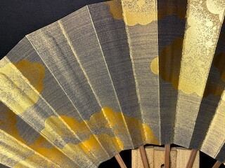美しいゴールドの雲柄が特徴のシックな舞扇子です。寸法は9寸5分(約29㎝)、両面同柄です。高級感のあるスス竹を使用しています。