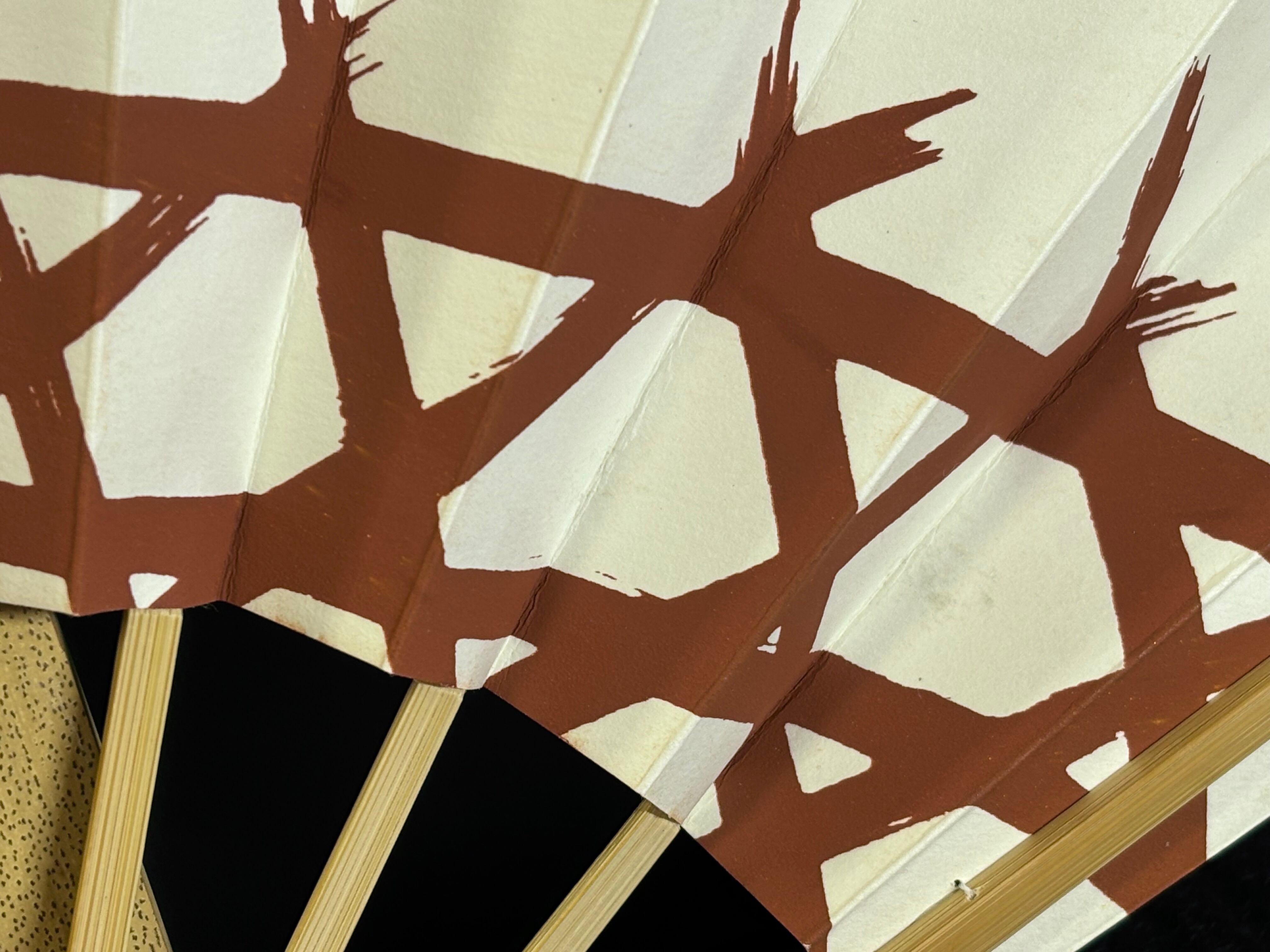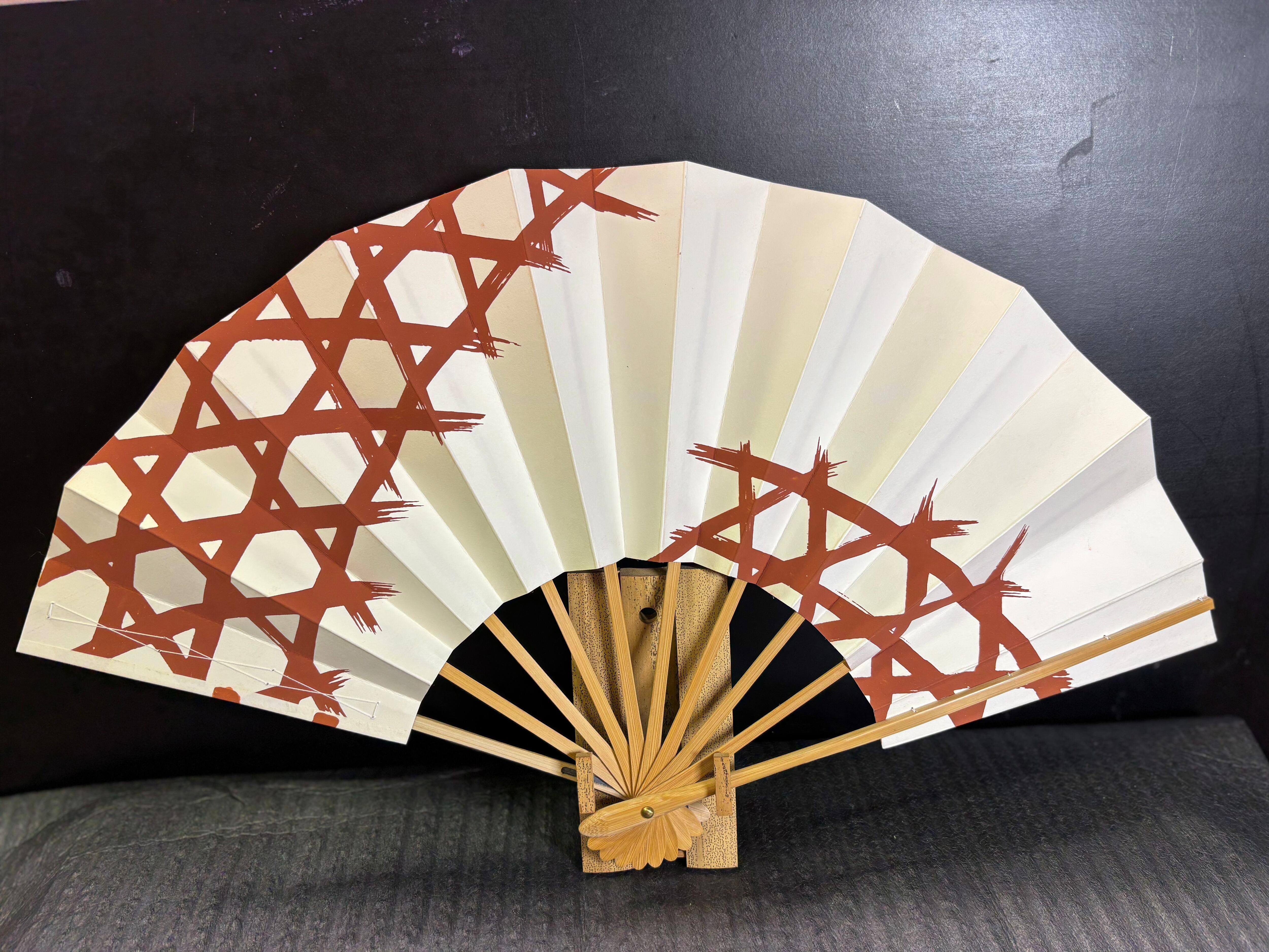 粋な籠目柄が魅力の舞扇子です。白地にさび朱色が映え、優雅な印象を与えます。